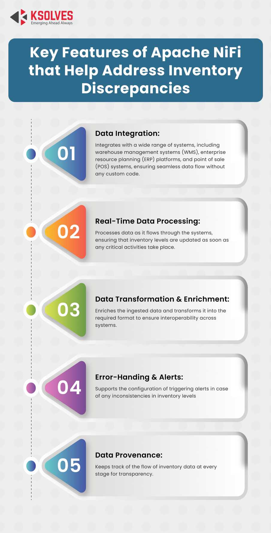 To avoid the consequences of inventory discrepancies, it becomes necessary to streamline inventory management with automation and real-time data processing. Many businesses prefer using Apache NiFi for real-time data processing and automating & integrating data flows from multiple inventory sources to ensure the stock levels match with the ones recorded in the inventory management system.